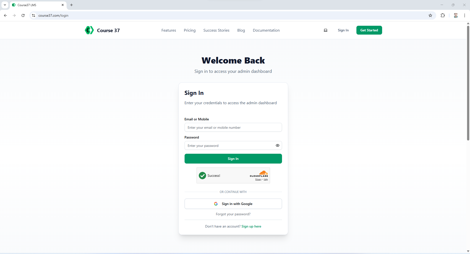 Access your Course37 admin dashboard with email/mobile and password or Google sign-in
