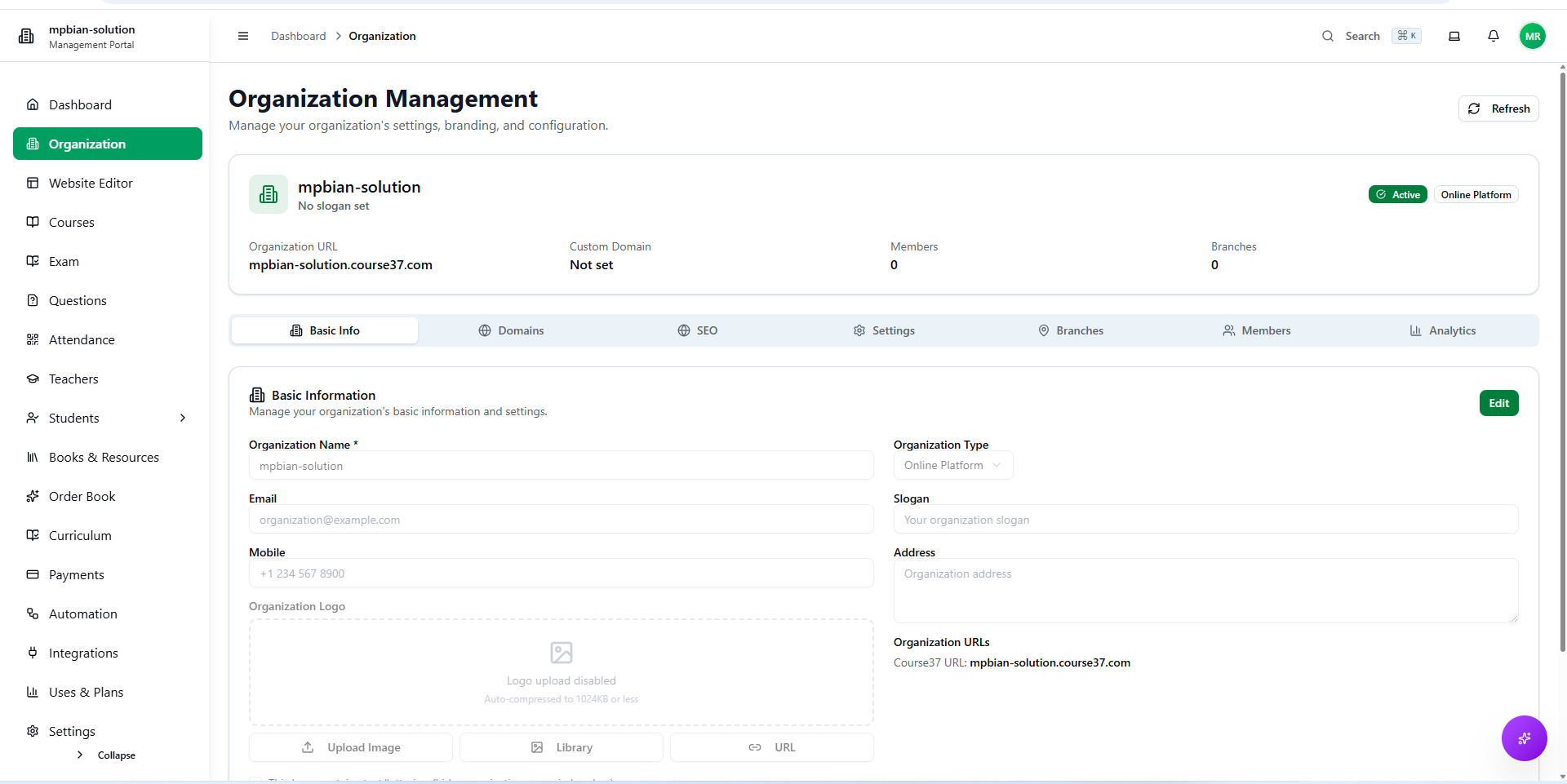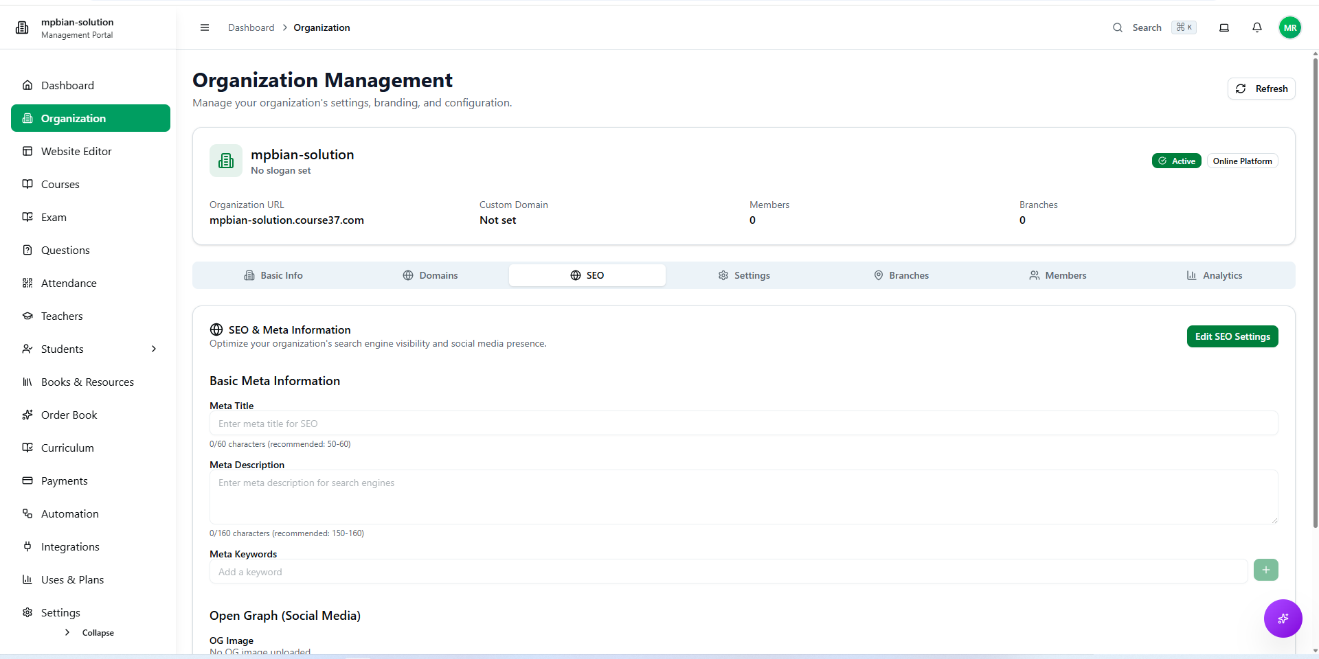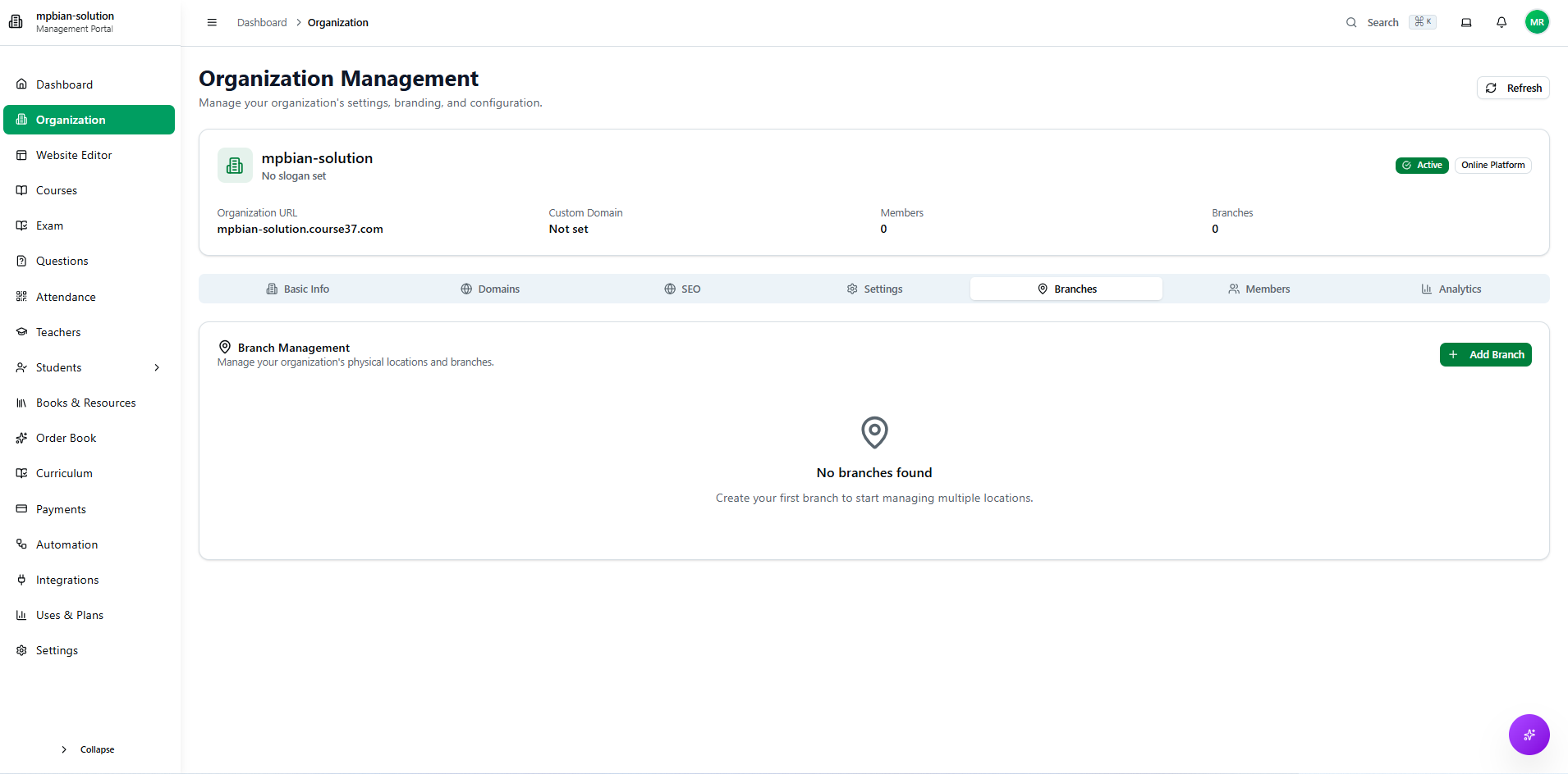 After creating your organization, you can configure various settings from the Organization Management section. This includes basic info, domains, SEO, general settings, branches, team members, and analytics.