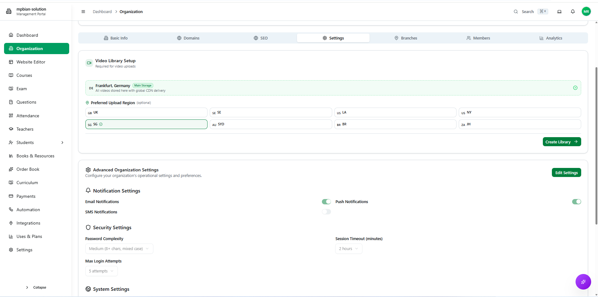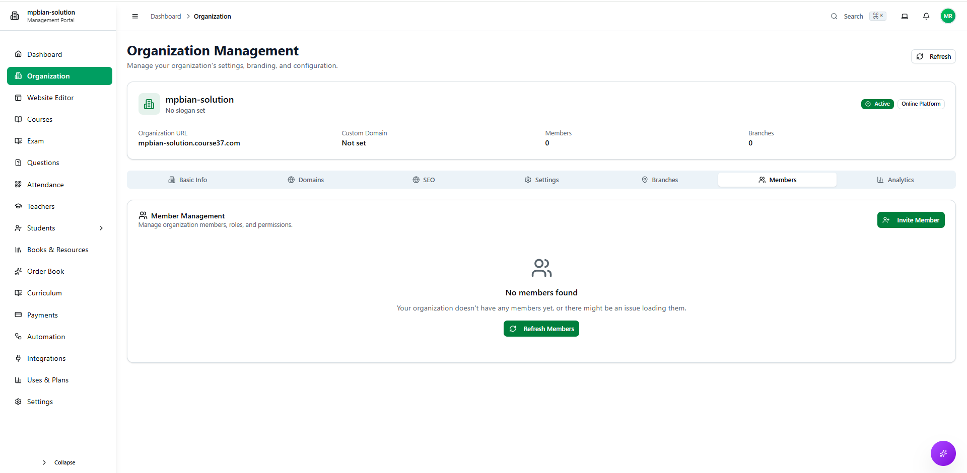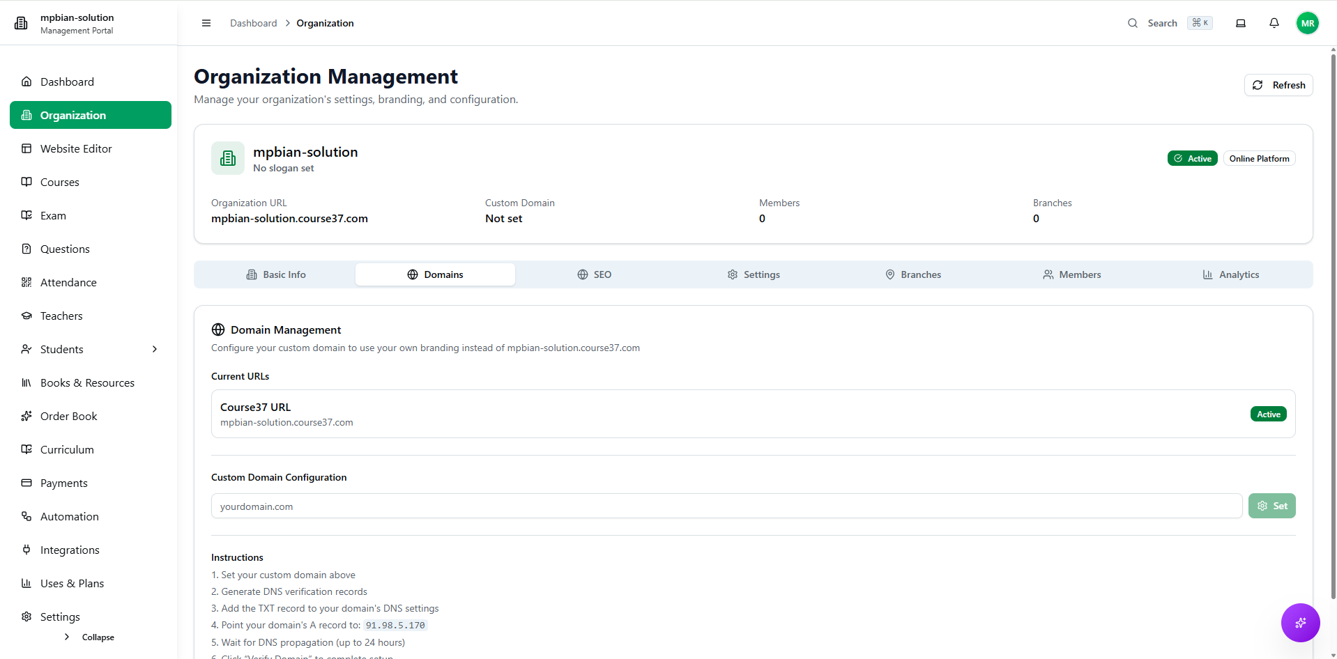 After creating your organization, you can configure various settings from the Organization Management section. This includes basic info, domains, SEO, general settings, branches, team members, and analytics.