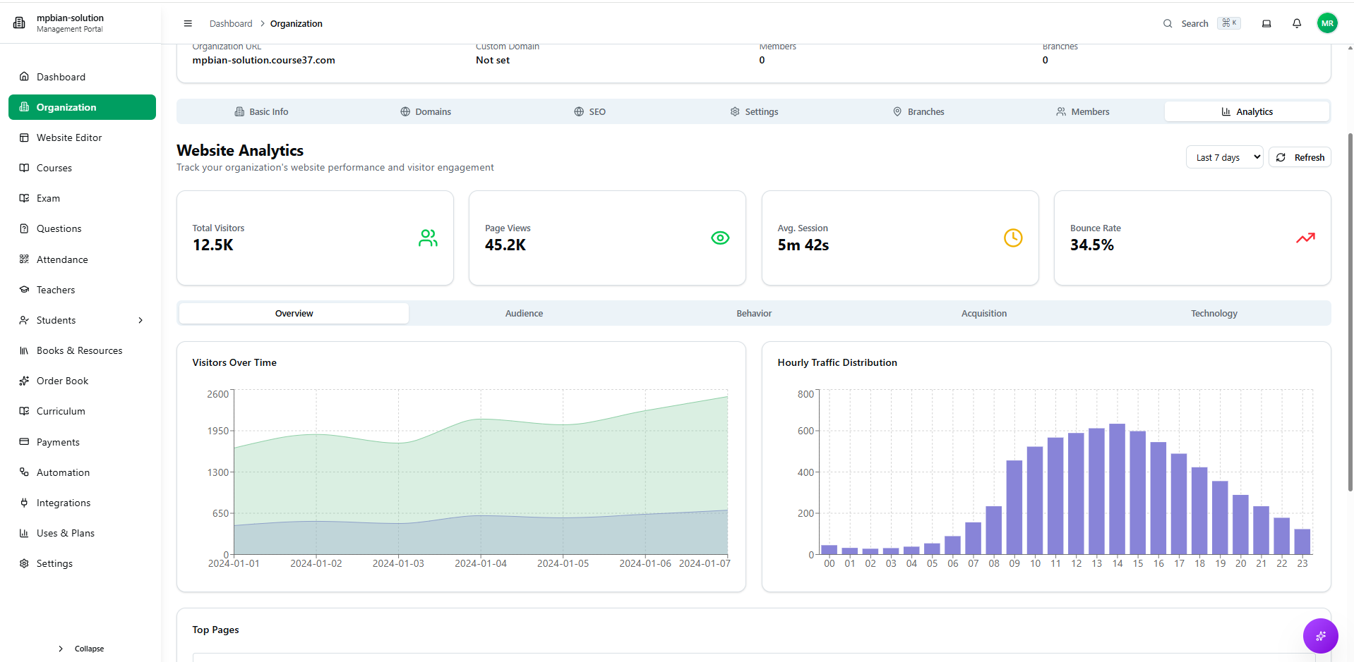 Configure your organization's basic info, domains, SEO, settings, branches, members, and view analytics